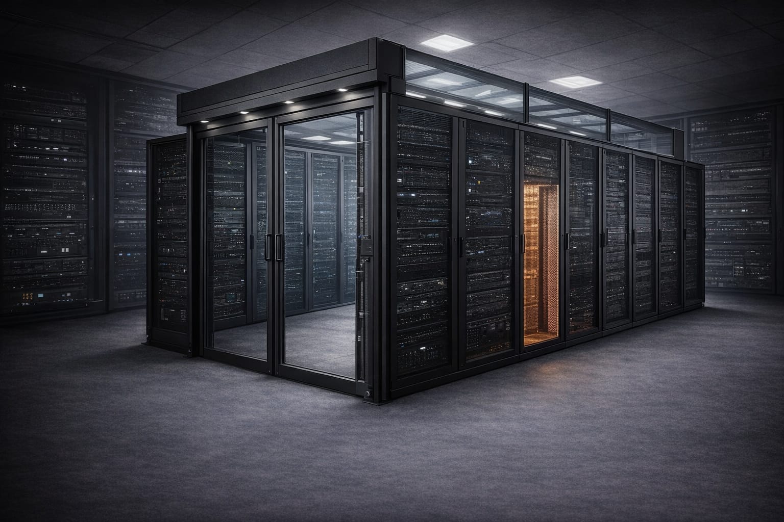 Hot exhaust fully enclosed, cold aisle isolated → CRAC efficiency +40%.